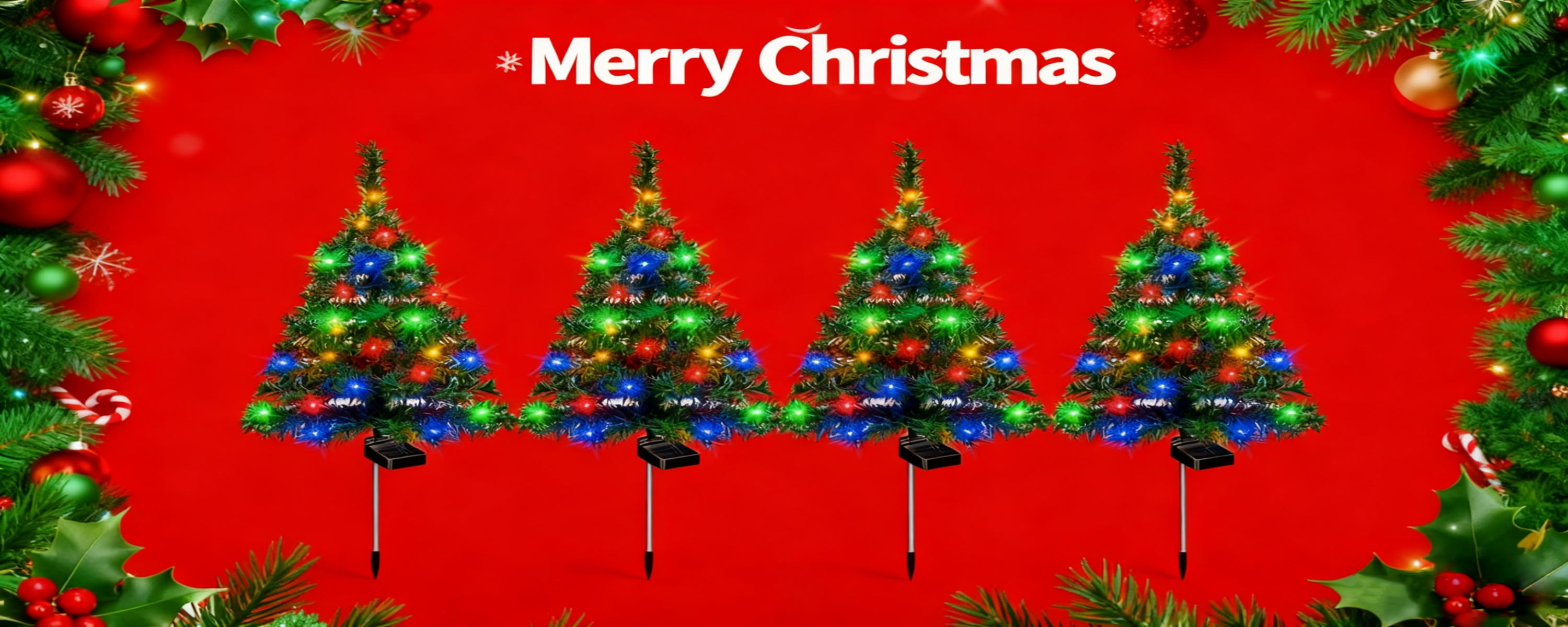 Solar-powered Christmas tree decorations create a festive atmosphere.