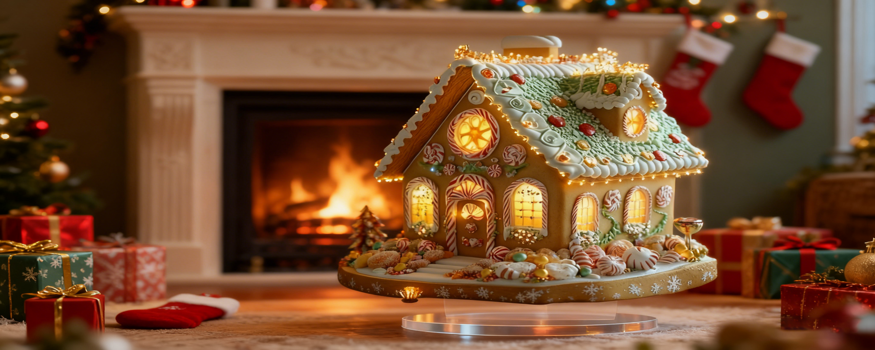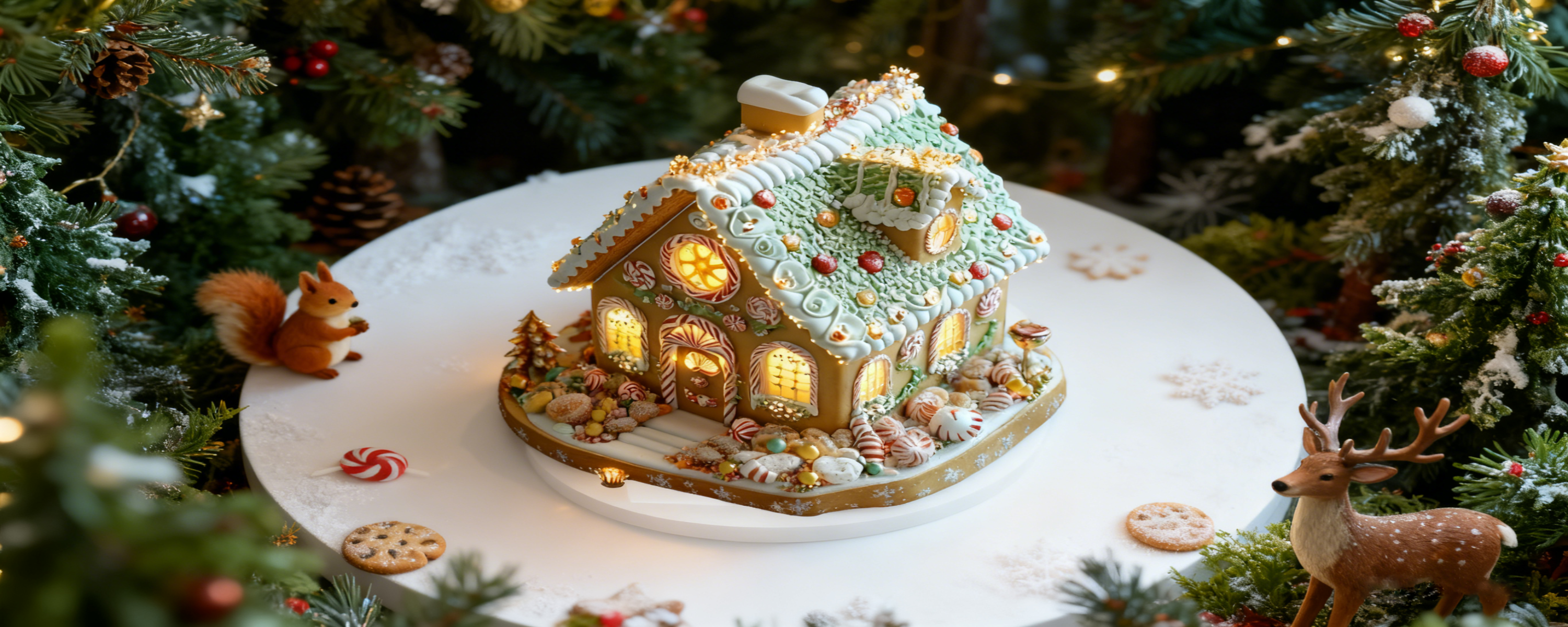 The gingerbread house is visually appealing and creates a strong Christmas atmosphere.