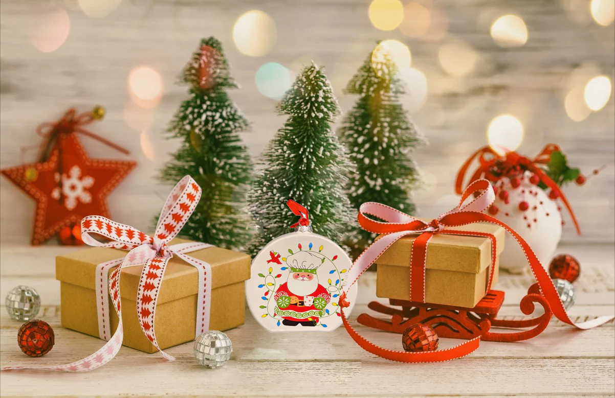 Our ornament set features a variety of beloved Christmas characters. From the jolly Santa Claus, dressed in his traditional red and white, to the cute reindeer, ready to help Santa on his sleigh ride. There's also an endearing penguin, snug in a green scarf and holding a festive mug, a cheerful elf carrying a present, a friendly snowman baking cookies, and a charming gingerbread man. Each character is depicted wearing a chef's hat, adding a fun and whimsical touch to the designs. Colorful Christmas lights encircle them, creating a vibrant and joyful atmosphere.