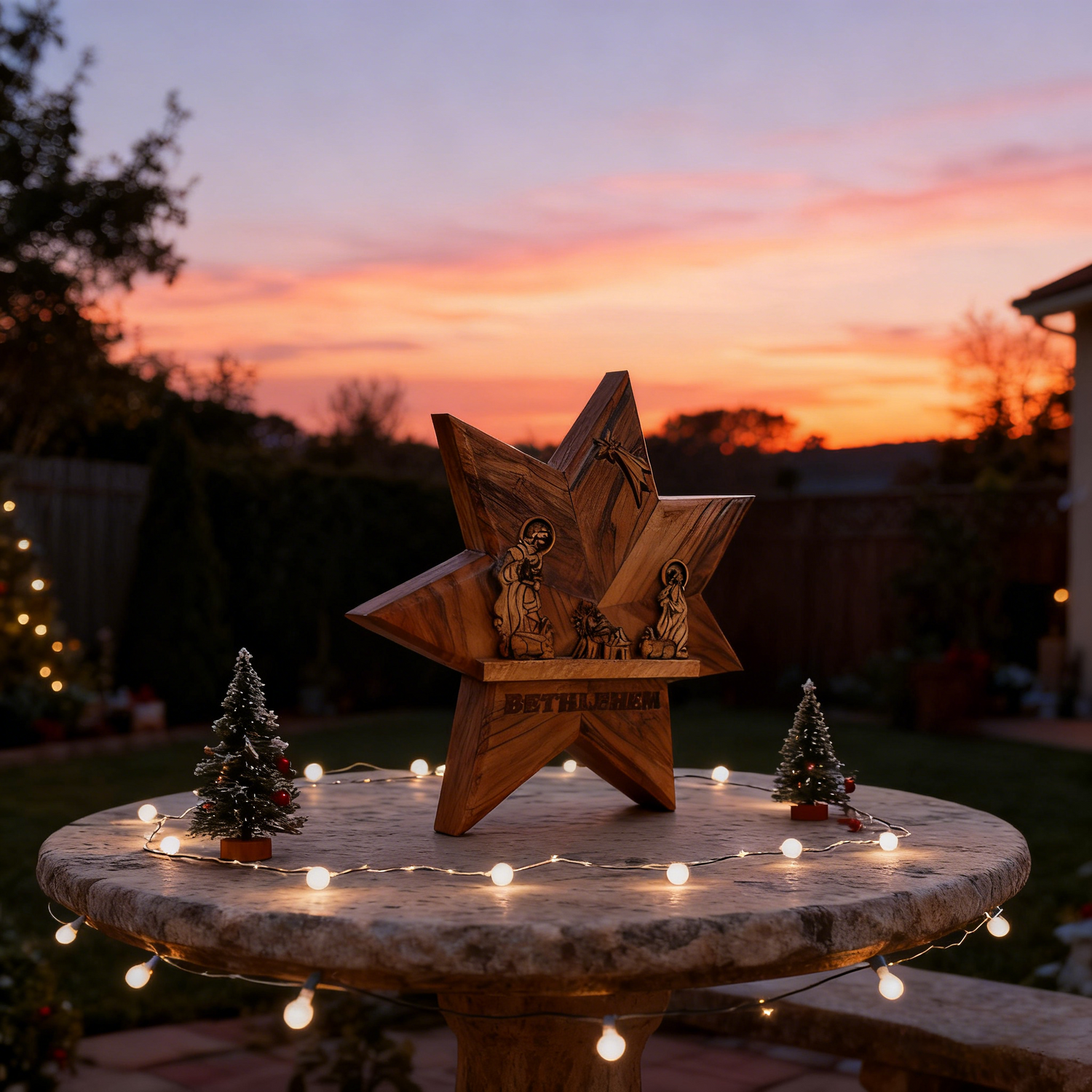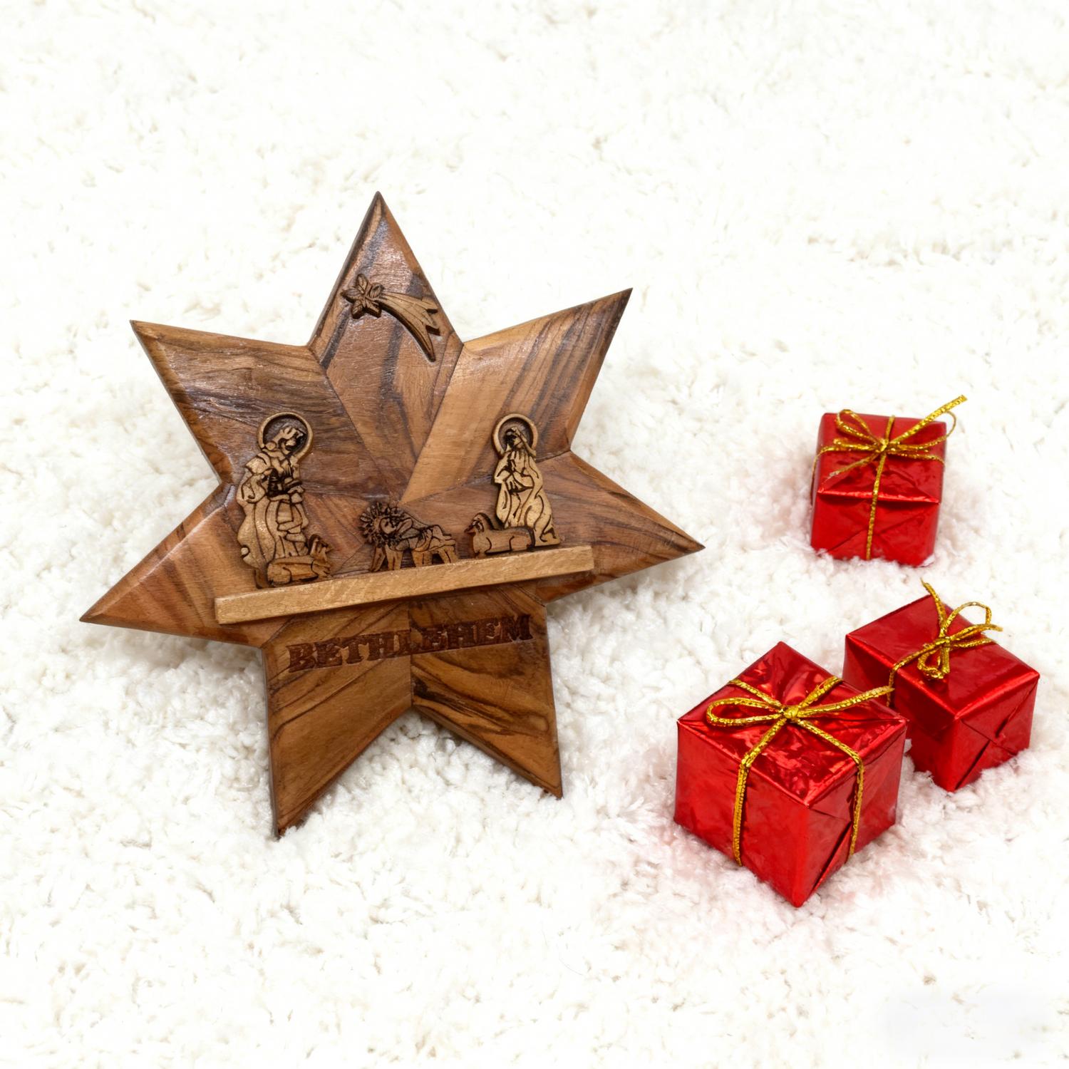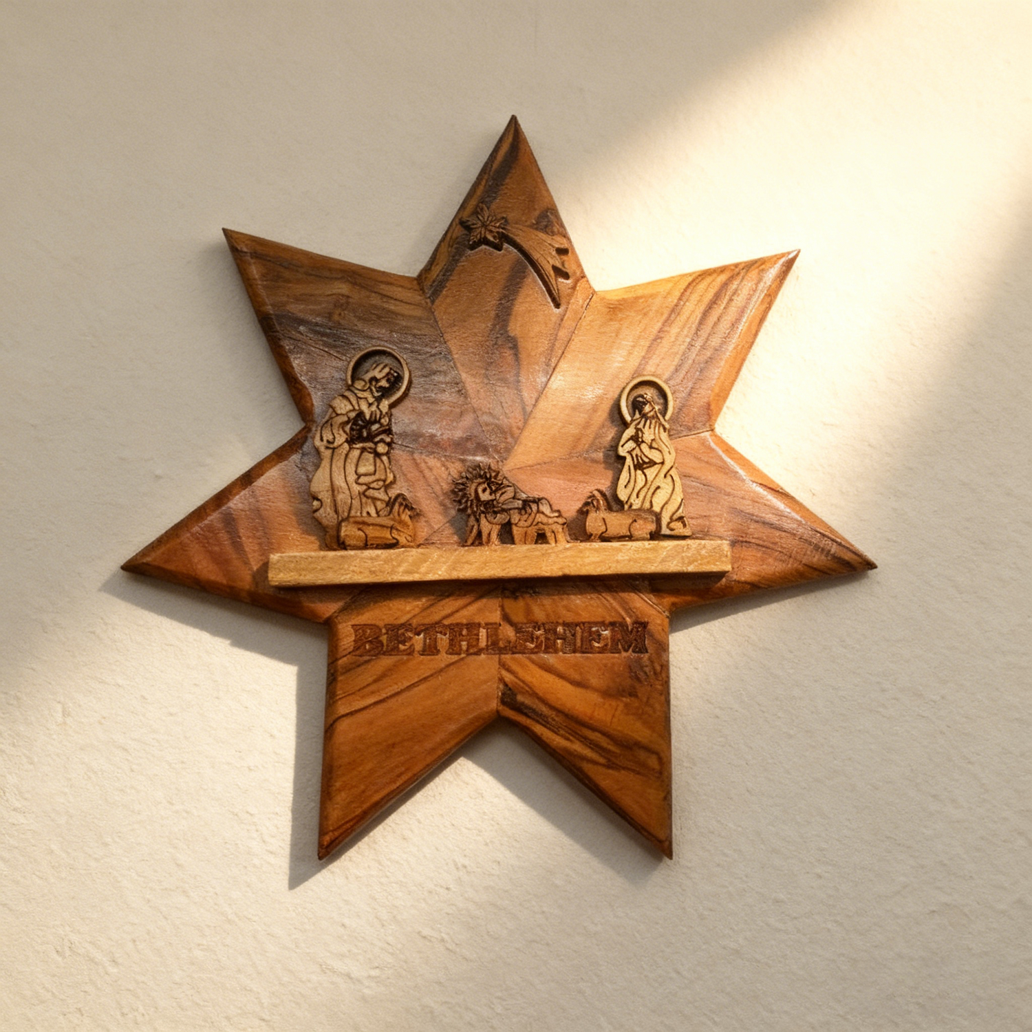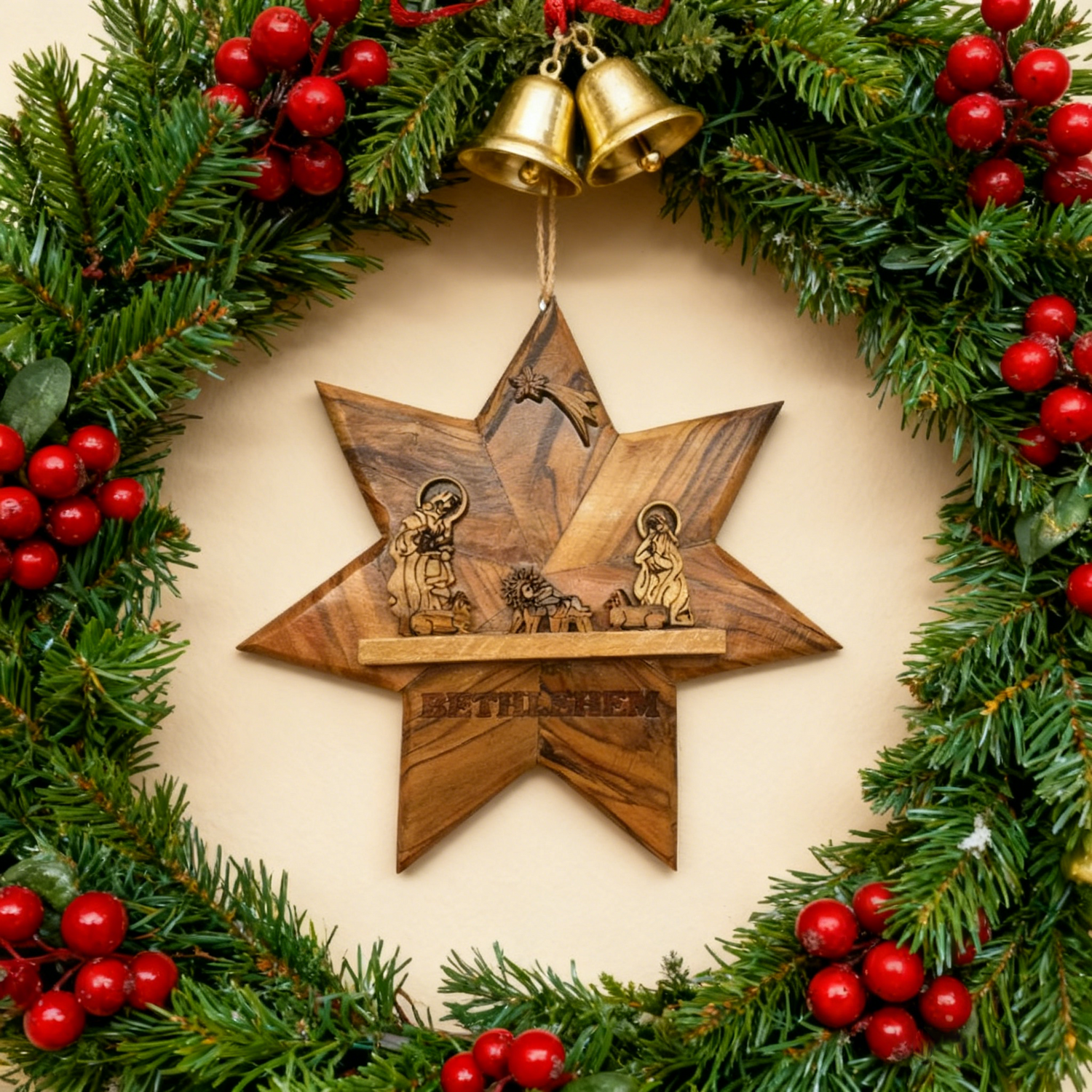 Bring the warmth of Bethlehem to your Christmas tree with this handcrafted olive wood star nativity ornament– a timeless blend of faith, artistry, and holiday magic.