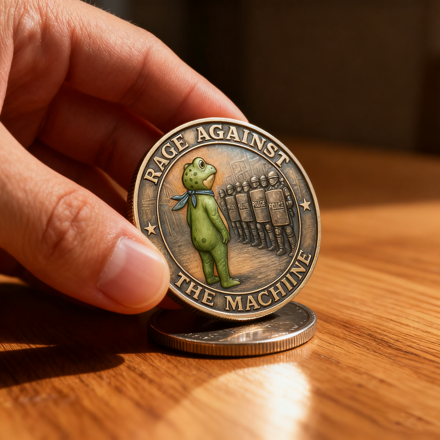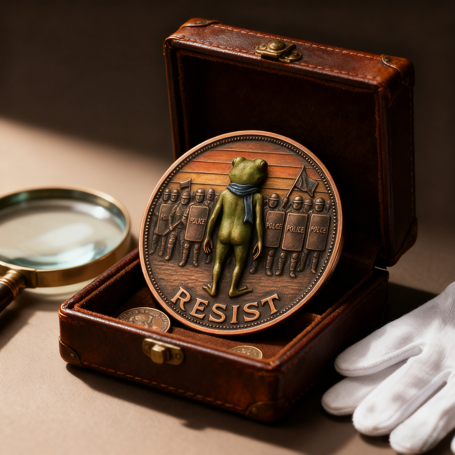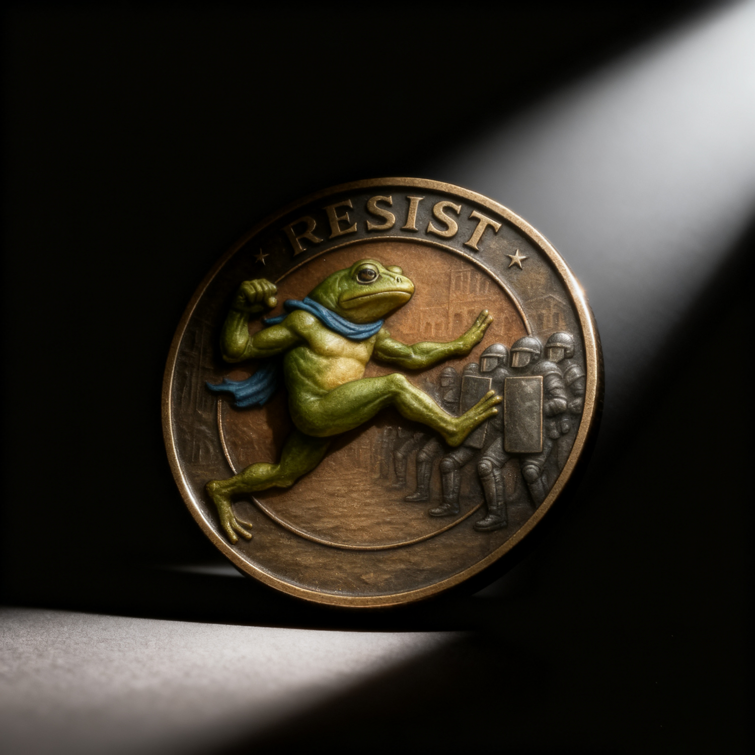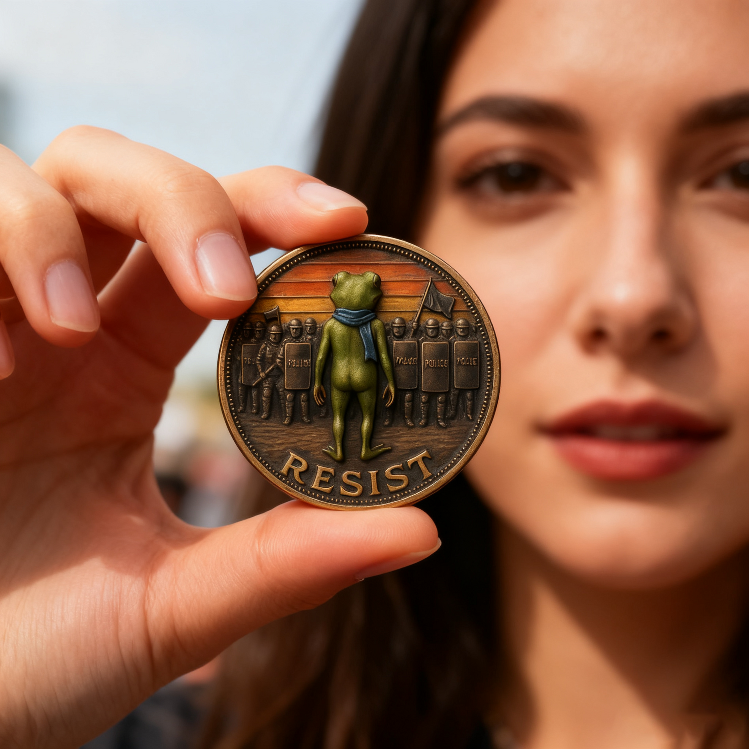 Forged from premium alloy with a vintage bronze-inspired finish, every coin boasts intricate 3D detailing—from the texture of the frog’s skin to the grit of riot shields. The hand-applied color accents (like the frog’s vivid green and the blue scarf) ensure each piece is unique. Unlike brass, this alloy offers enhanced durability and corrosion resistance, making your coin a lasting emblem of resistance.