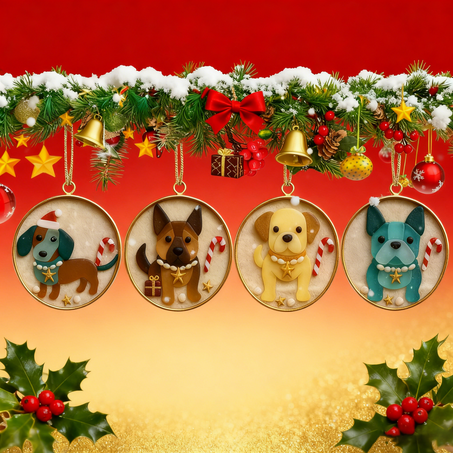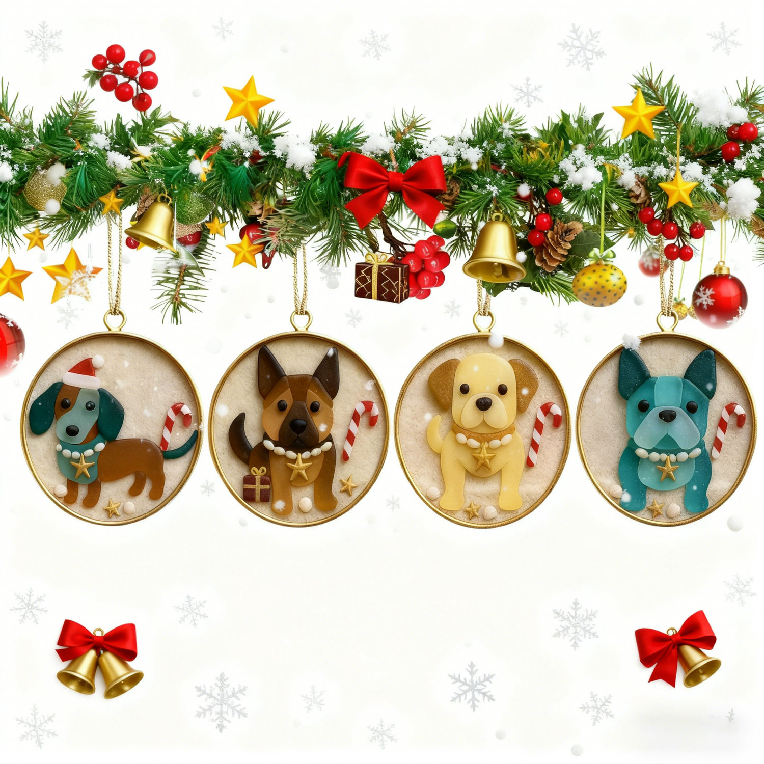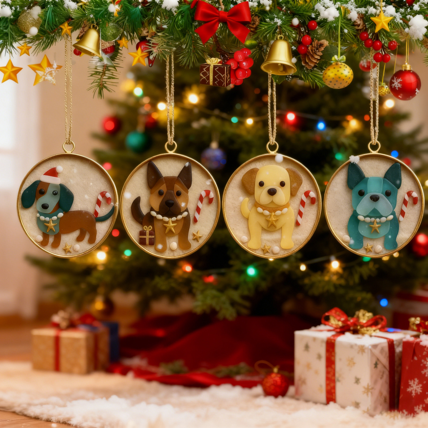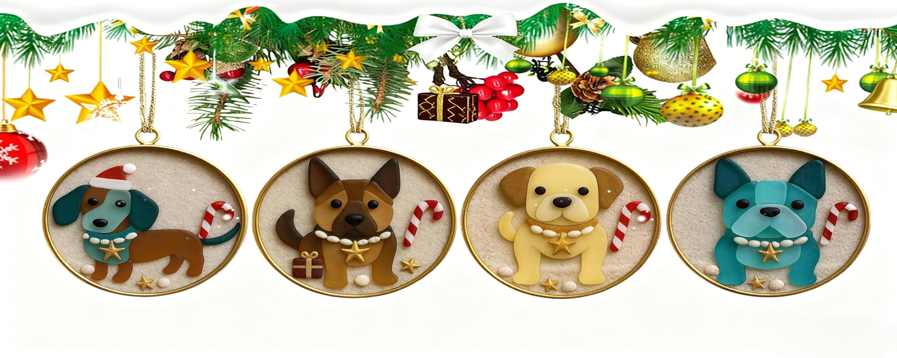 Each round ornament captures the unique charm of beloved dog breeds, blending their distinct personalities with holiday cheer