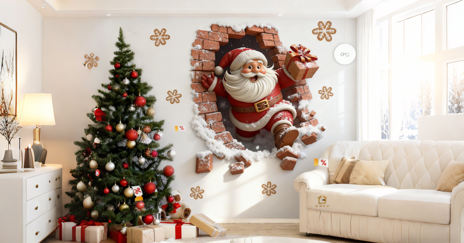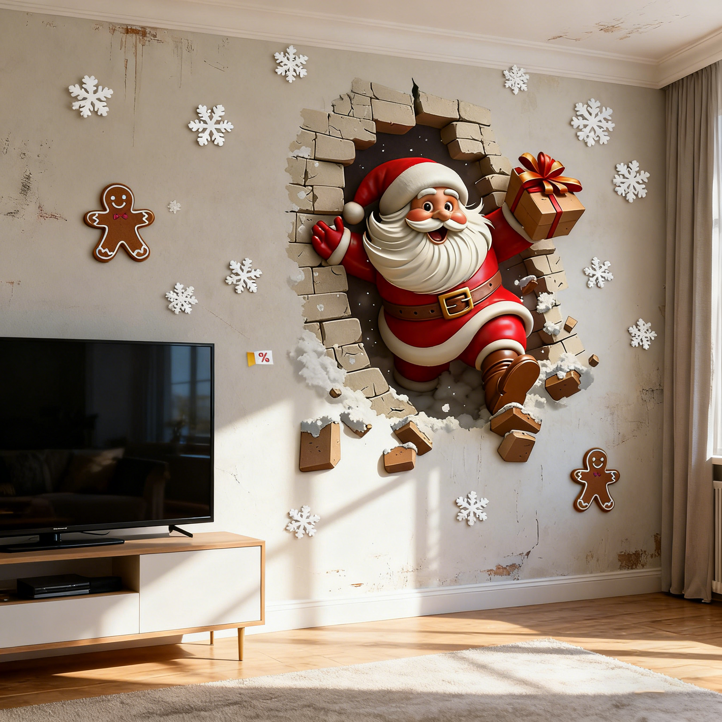 Watch Santa burst through a "broken" brick wall while clutching a wrapped gift. Paired with delicate snowflake decals, this sticker turns any plain wall into a festive focal point that feels like a scene from a Christmas story.