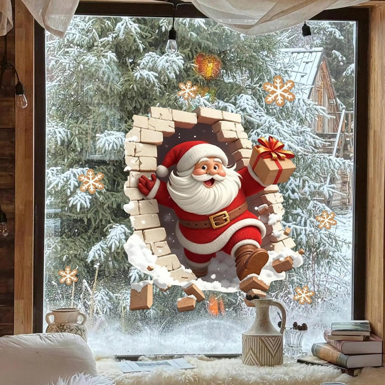 The sticker mimics a frost-flecked, slightly cracked window pane, with jagged edges that catch the light and sell the 3D trick. His fluffy white beard has faint snow dust on the tips, his red hat is tilted as if he’s hurrying, and those wide, grinning eyes feel like he’s about to wave—exactly the kind of small, cozy surprise that makes kids gasp and adults smile.